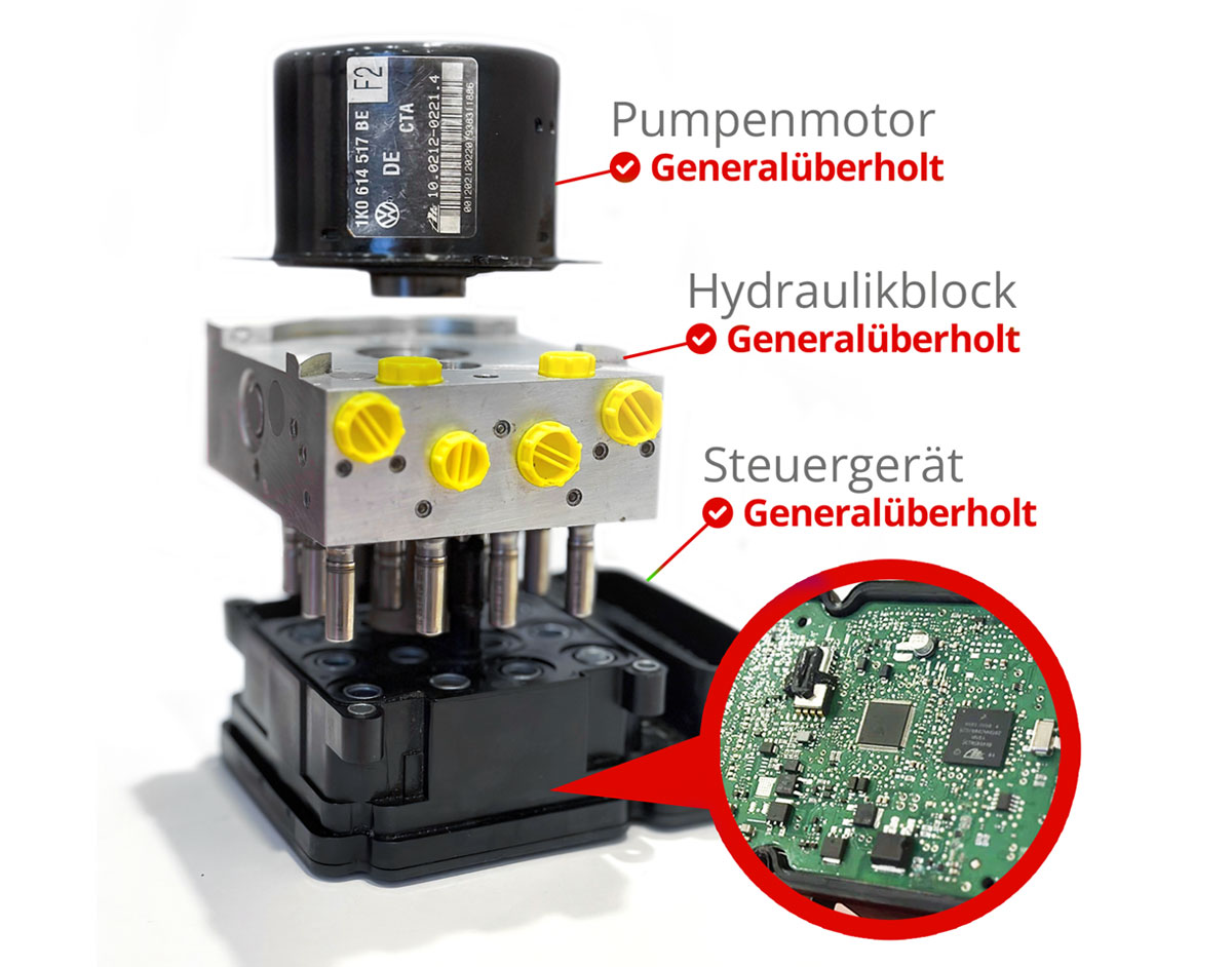 Diese Einheit enthält einen generalüberholten Pumpenmotor, Hydraulikblock und ein leeres Steuergerät. Sie ist sofort verfügbar, muss jedoch nach dem Einbau neu codiert werden. Ideal für Werkstätten mit Codiermöglichkeit.